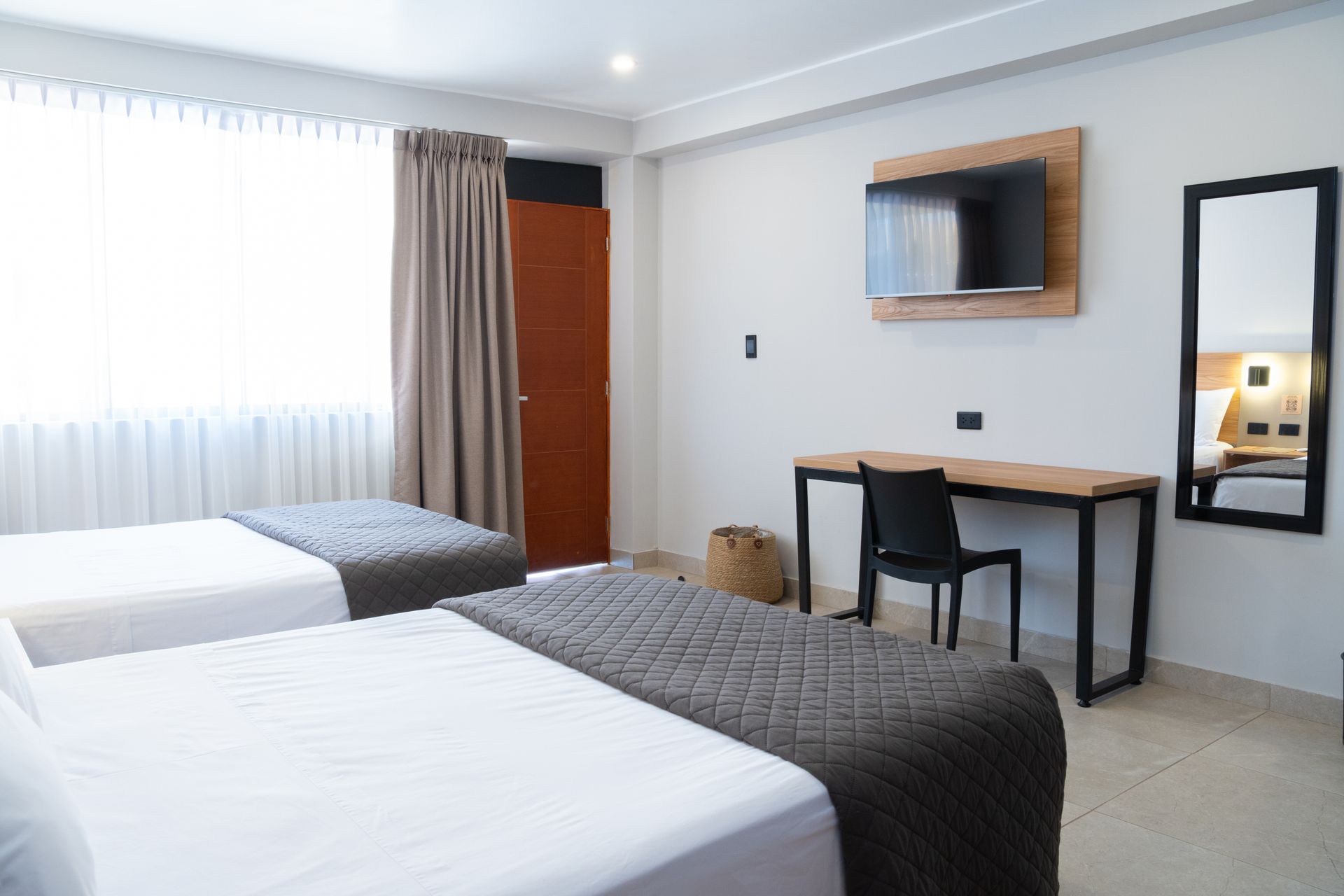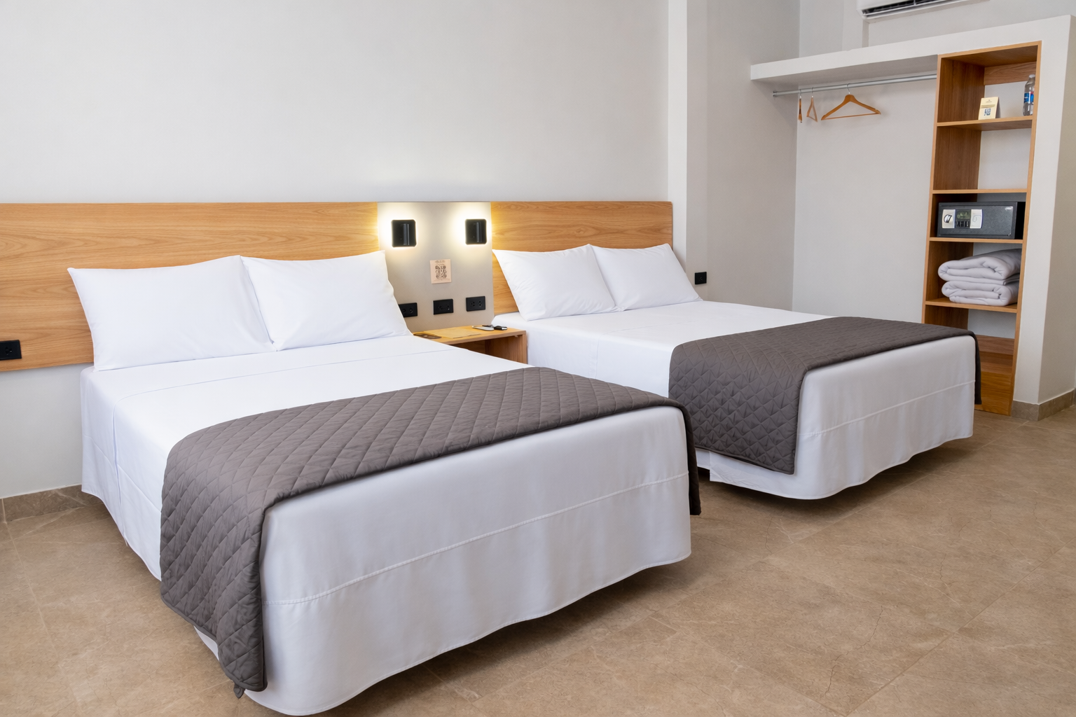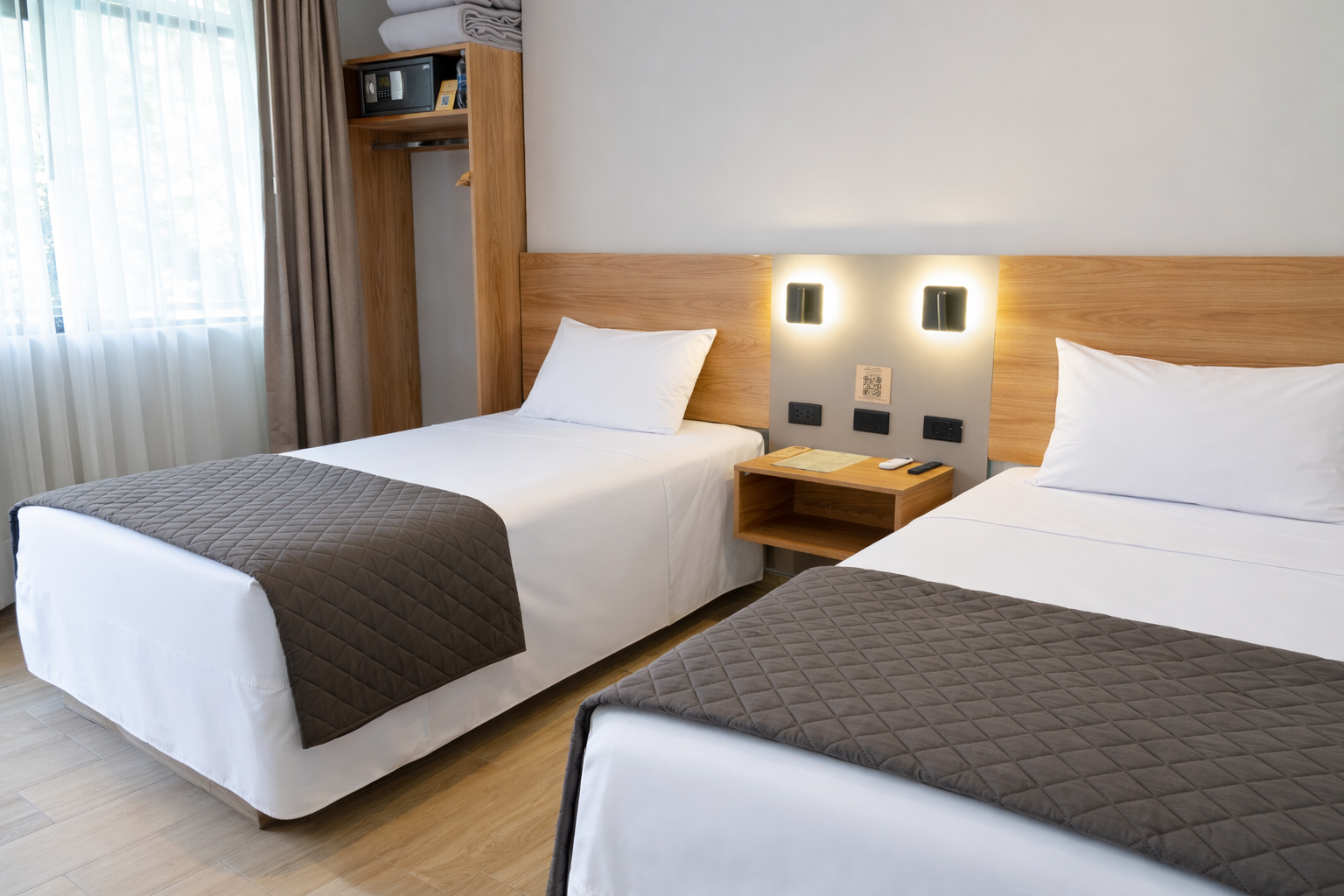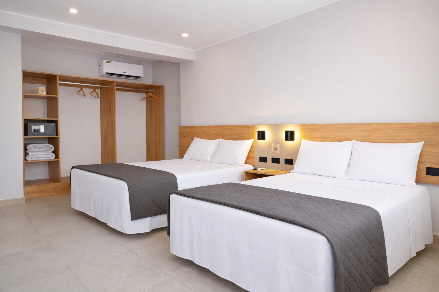A bright and comfortable space with two beds, ideal for friends or travel companions. Includes a private bathroom and calming, minimalist design.