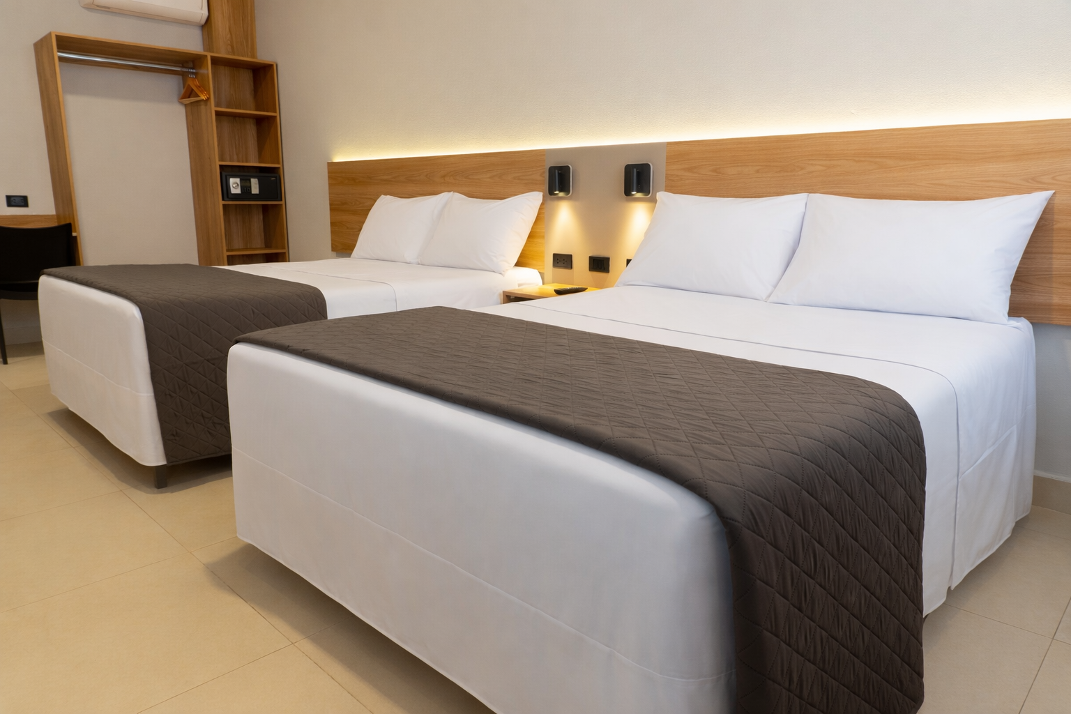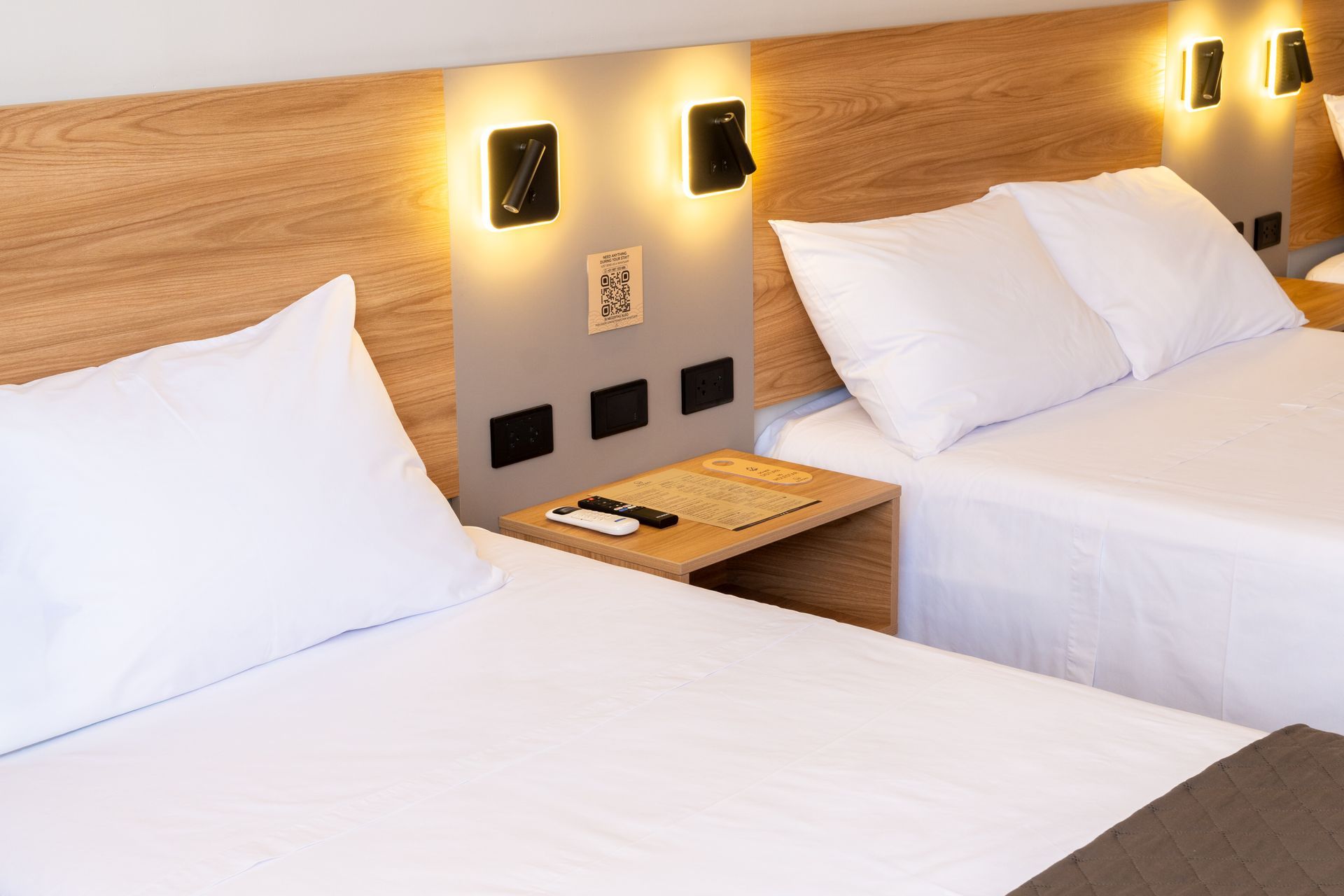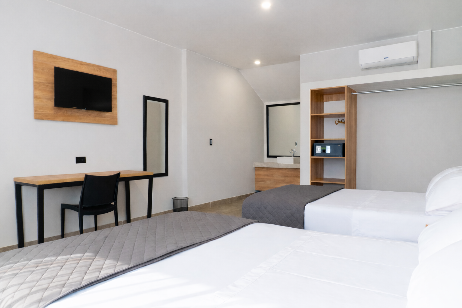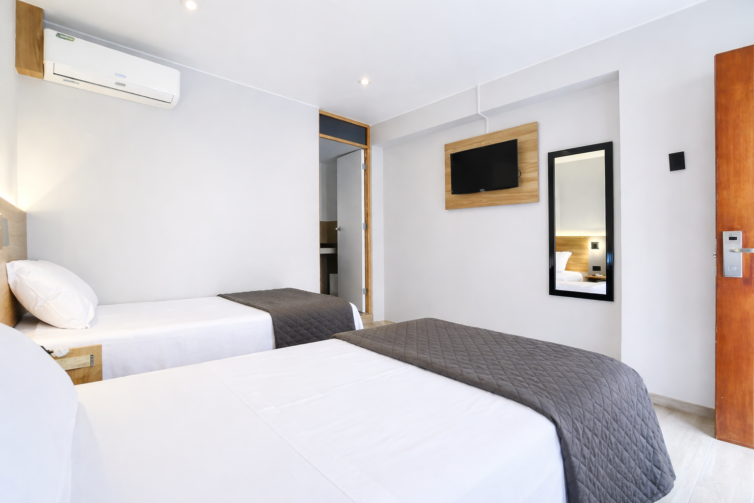 A bright and comfortable space with two beds, ideal for friends or travel companions. Includes a private bathroom and calming, minimalist design.