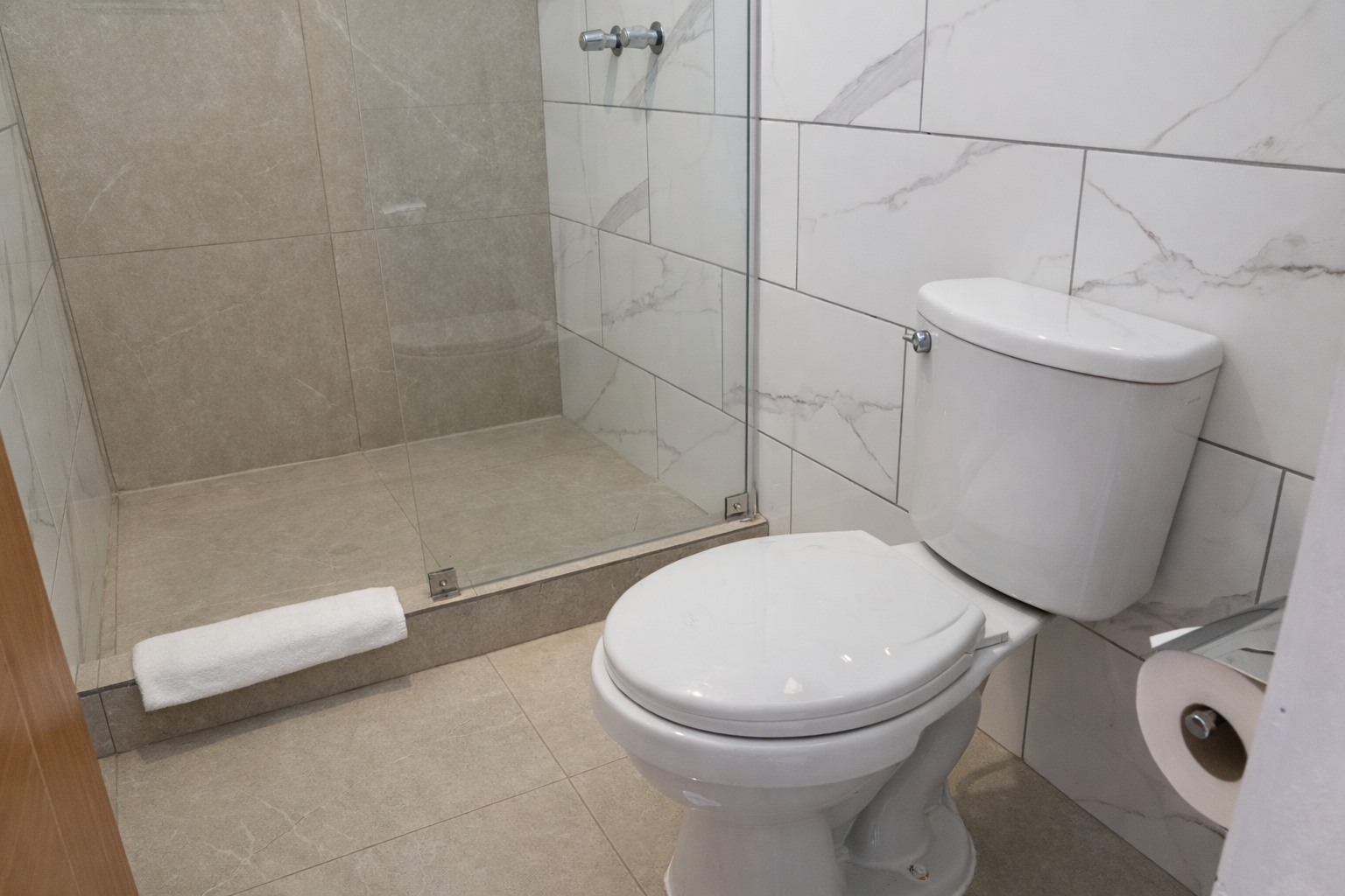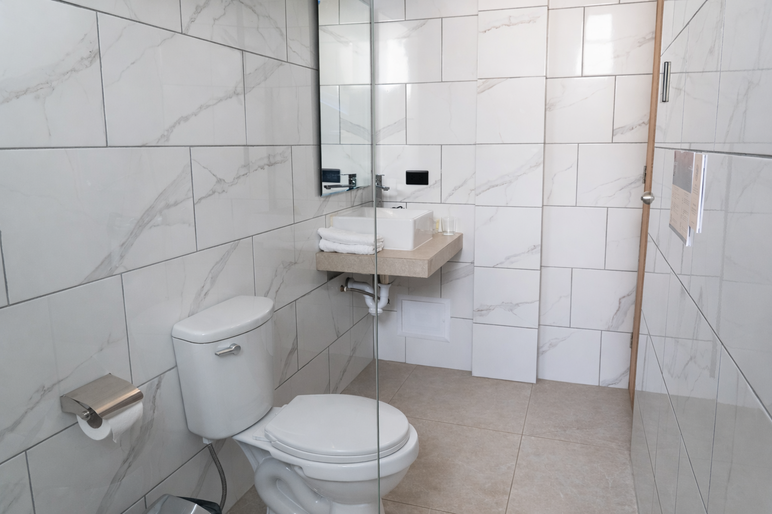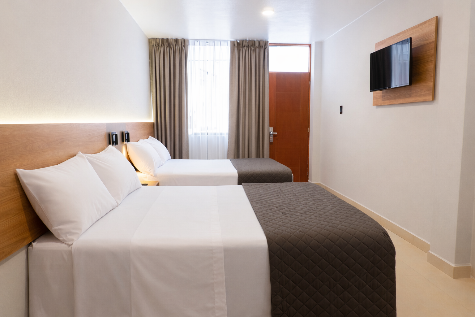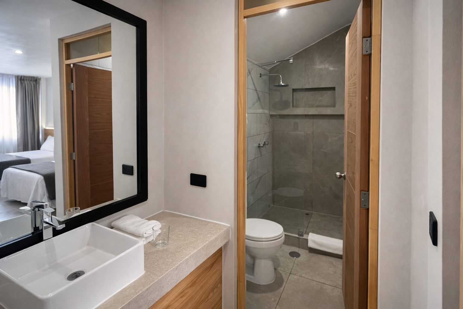 A bright and comfortable space with two beds, ideal for friends or travel companions. Includes a private bathroom and calming, minimalist design.