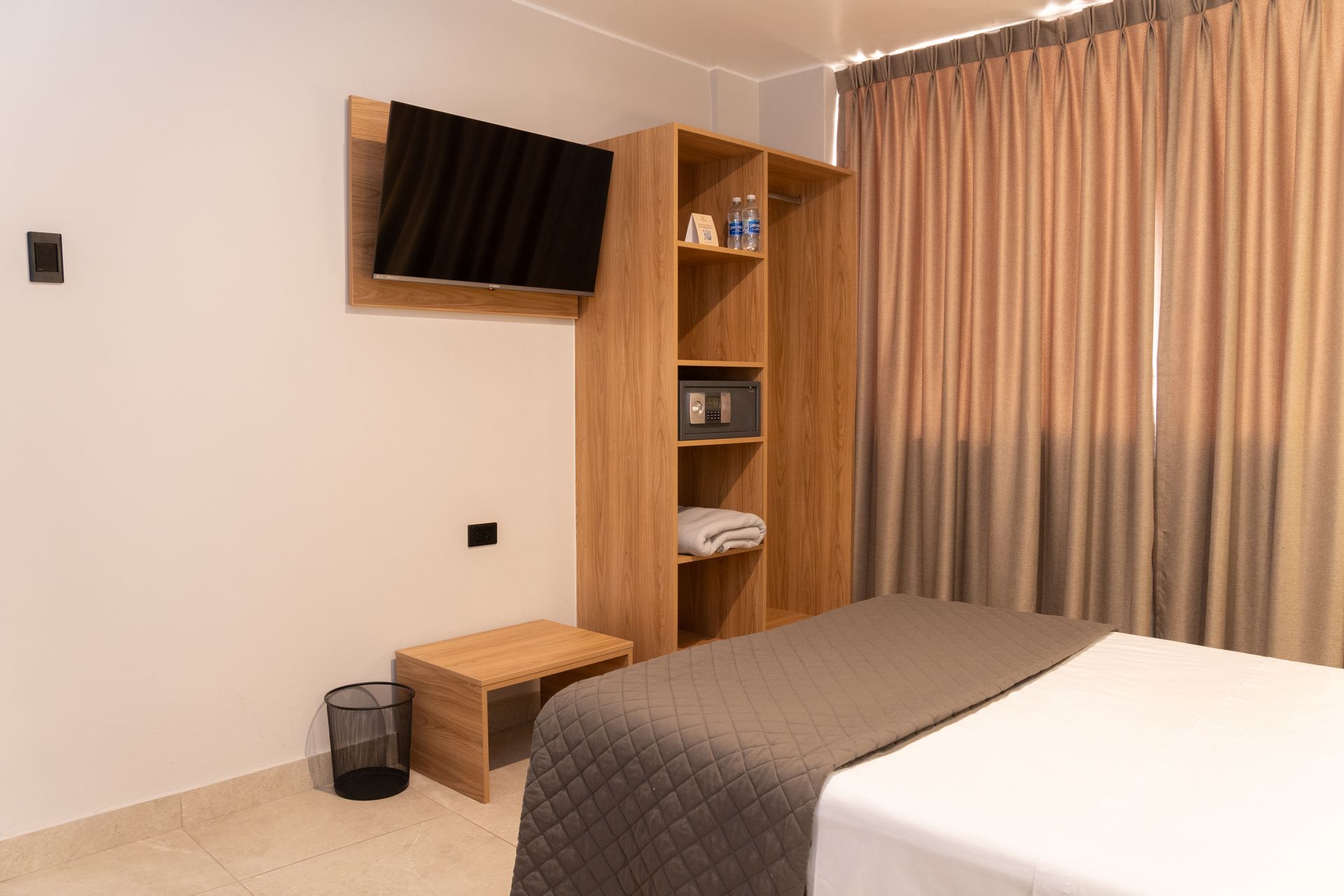 A cozy, air-conditioned retreat for two with a comfortable double bed and essential amenities—perfect for couples seeking rest and simplicity.